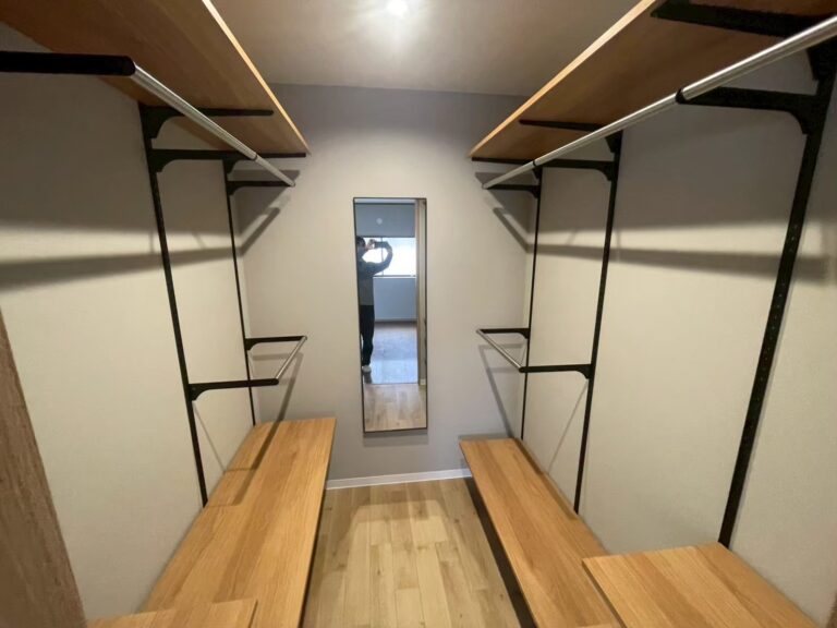 従来のクローゼットの壁を撤去し、隣接する廊下側の収納のデッドスペースとなっていた部分を組み込むことで、ゆったりと人が入れるサイズのウォークインクローゼットを新設しました。これにより、既存の居住スペース…